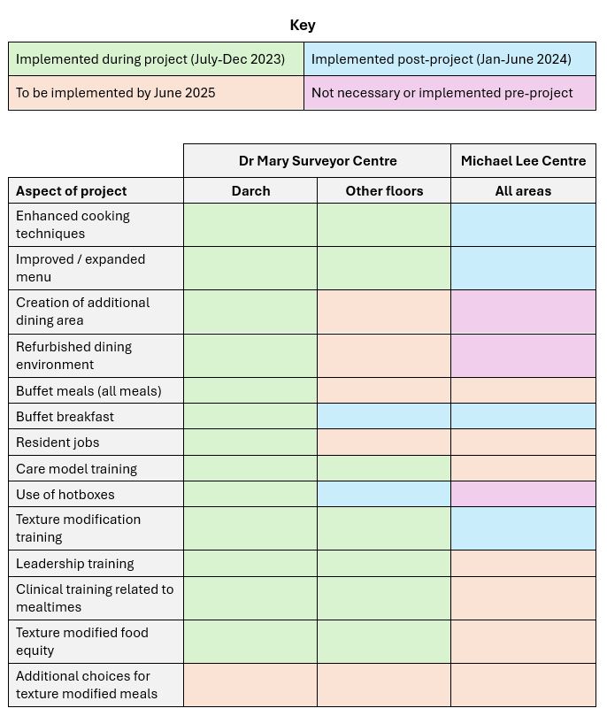 One of the real successes of the project to build on is the provision of texture-modified food. With the correct training and kitchen role reviews, we were able to achieve food equity. This is yet to be fully implemented at the Michael Lee Centre, and our wider aim at both Centres is to be able to provide additional texture-modified choices. We may not be able to texture modify all items on the menu, but if we can provide equity on one main meal and nutritious alternatives to that meal, then we will have come a long way from before the project.